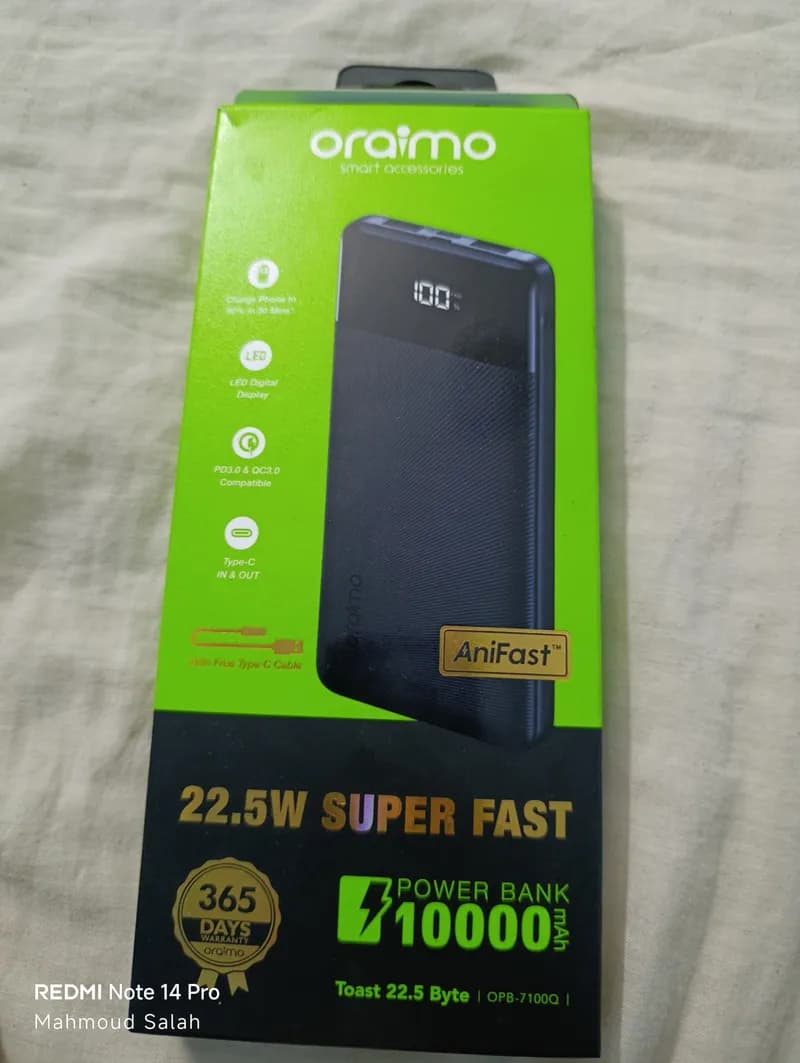 متاح باور بانك من شركة اورايمو 10000 مللي امبير *** واط سرعة الشحن بيشحن شحن سريع 100٪ تقريبا في ساعة واحدة شاشة ليد لعرض سعة الشحن مدخلين USB ومدخل type-C الجهاز حالة الزيرو متلمسش خالص هو اتفتح فقط من العلبة. . سبب البيع جبت فون جديد ومعوتش ف حاجة *** مجاني لأي مكان بالجيزة