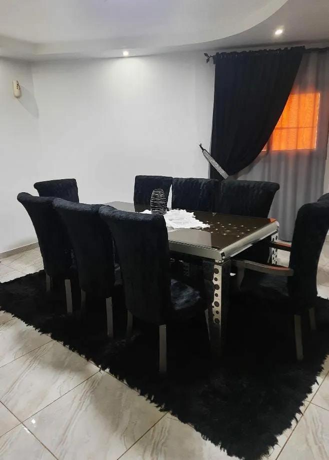 سفرة مودرن كاملة مكونة من 8 كراسي متنجديدن فرو اسباني وجميع الرجول الامامية للكراسي عليها استانلس فوق الخشب.