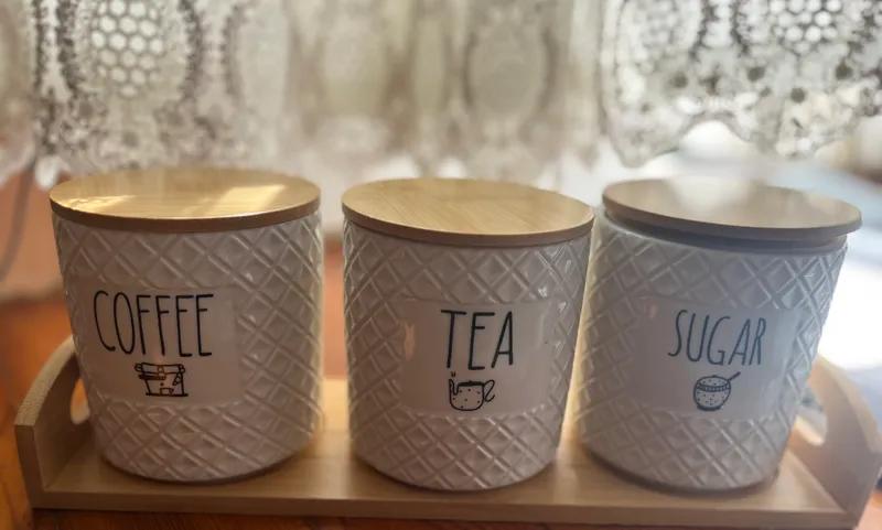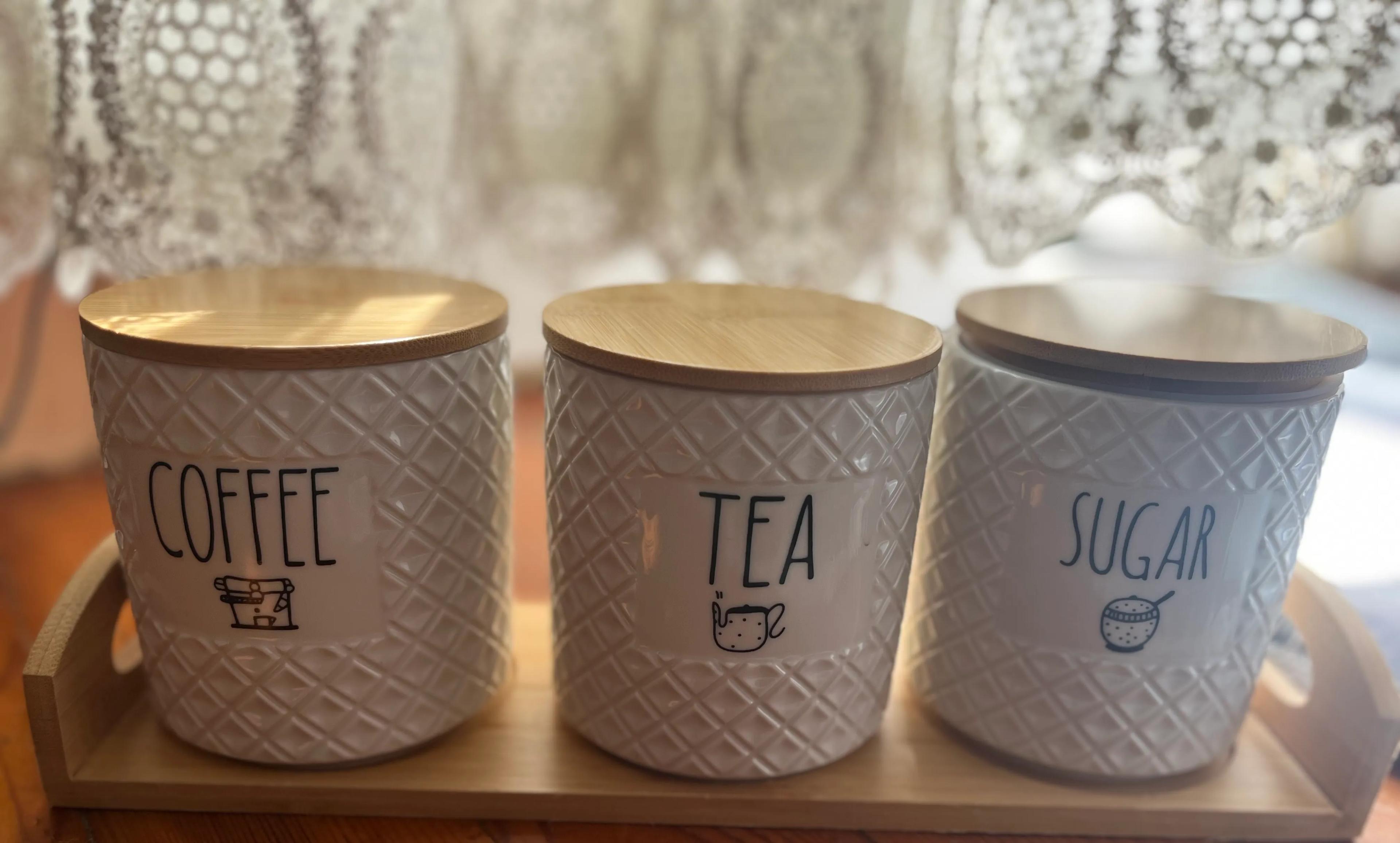 طقم برطمانات شاي - سكر - قهوة على صينية خشب