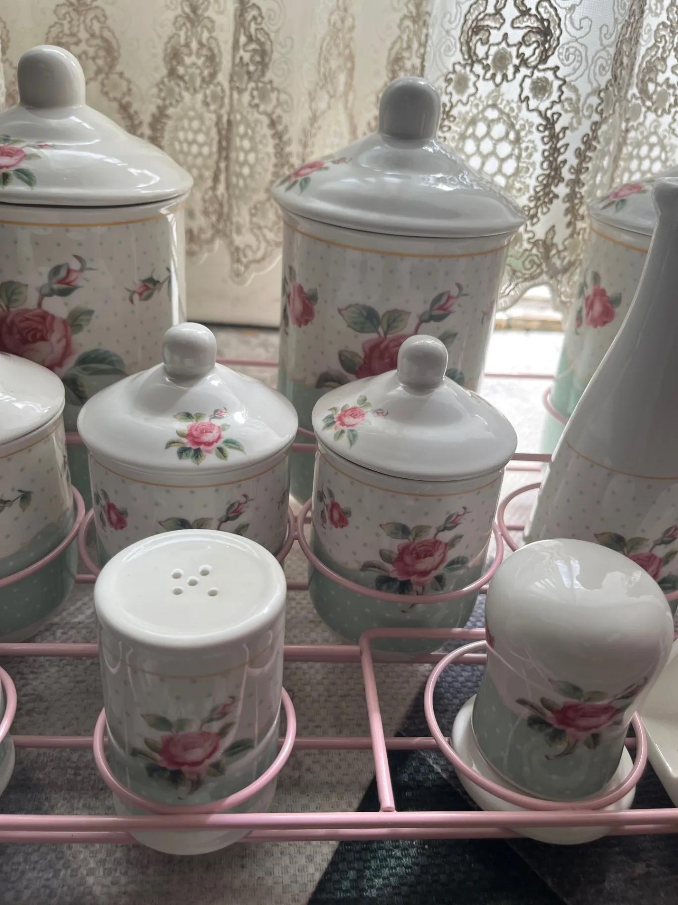 للبيع طقم توابل بورسلين فاخر بنقشة ورد أنيقة وراقية، مكون من عدة قطع متنوعة كما هو موضح بالصورة، يشمل: