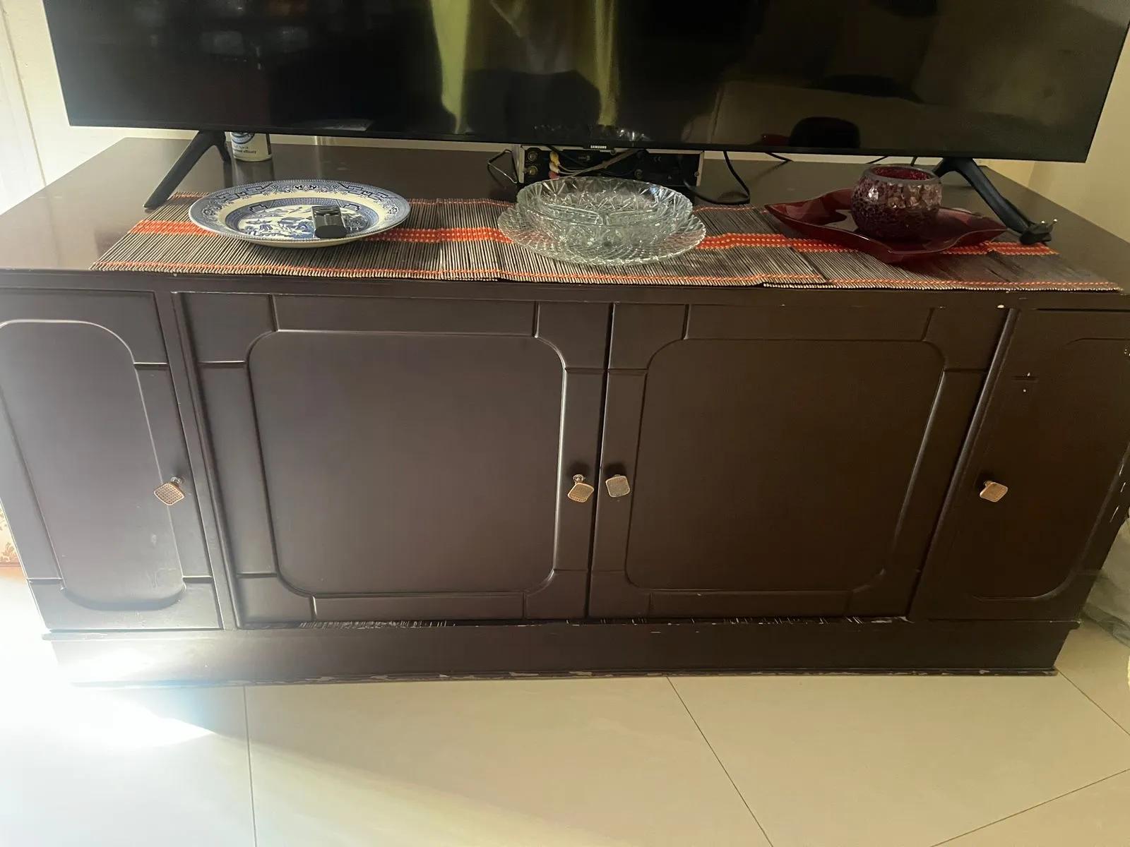 للبيع ترابيزة تليفزيون خشب زان 150*60 وبها عدد ٤ دلفة تخزين داخلي او مكتبة سفلية