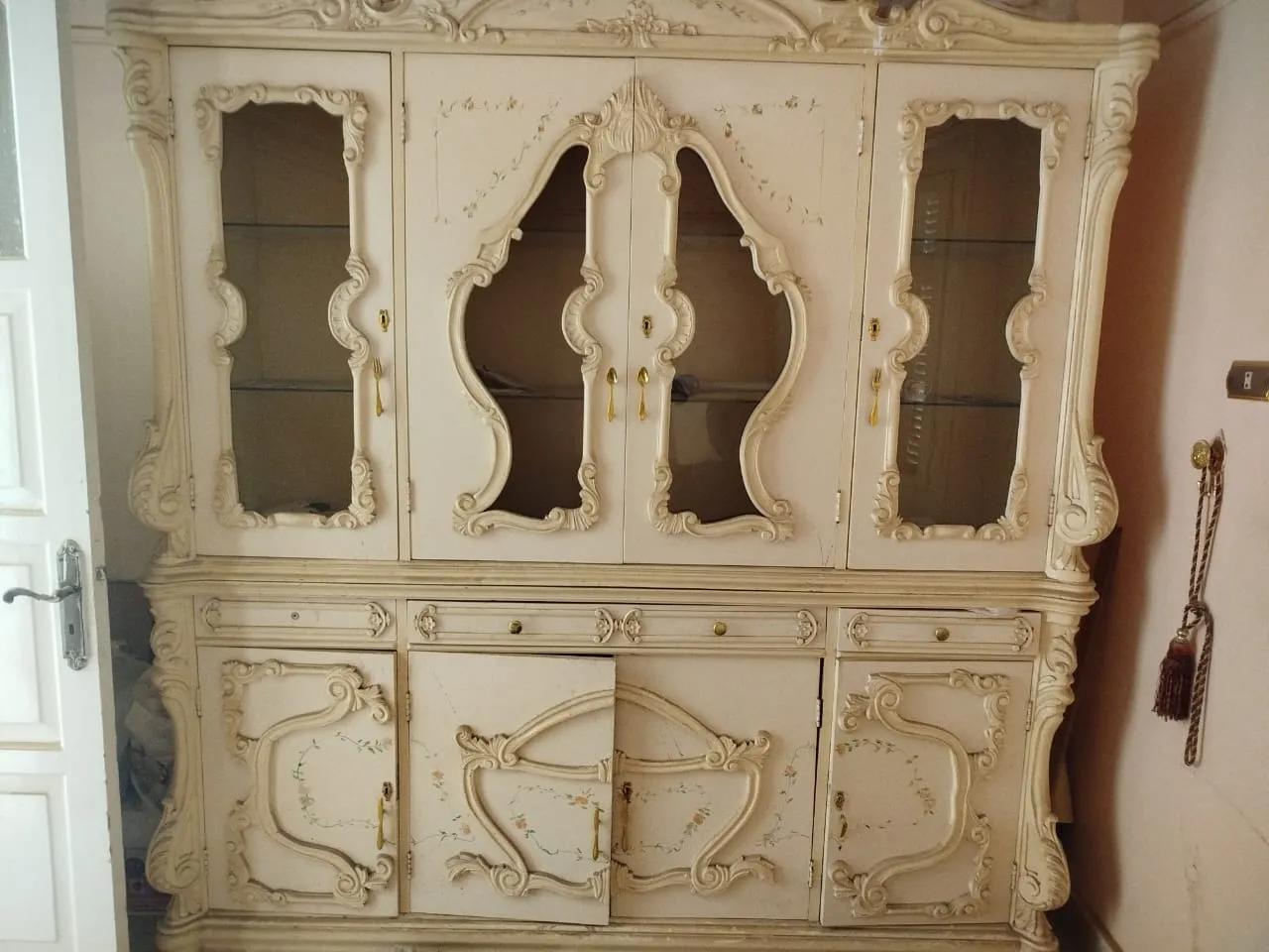 نيش صوفيا بدون سفره خشب زان دهان لاكيه عباره قطعتين فوق بعض القطعه الى فوق ٣ درفه زجاج والقطعه الى تحت ٣ درفه و٣ ادراج للمعالق وشوك وخلافه مطلوب