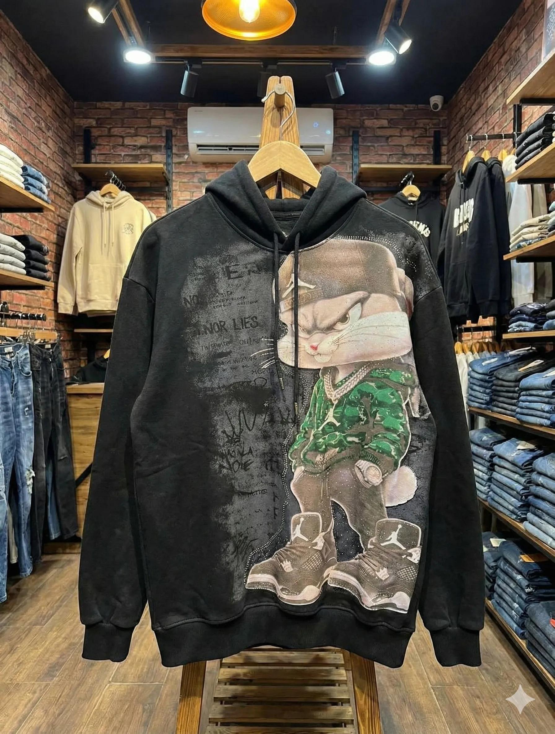الطباعة: باغز باني بستايل gangster كامل بجاكيت أخضر لامع + سلاسل + كاب خلفي، محاط بكتابات جرافيتي وستونز سودا تلمع تحت أي ضوء.