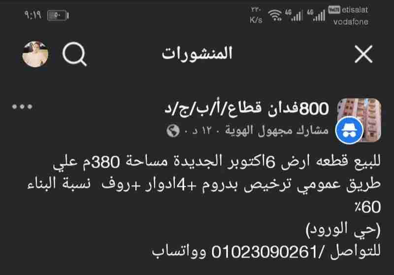 للبيع قطعه ارض 6اكتوبر الجديدة مساحة 380م علي طريق عمومي ترخيص بدروم +4ادوار +روف  نسبة البناء 60٪