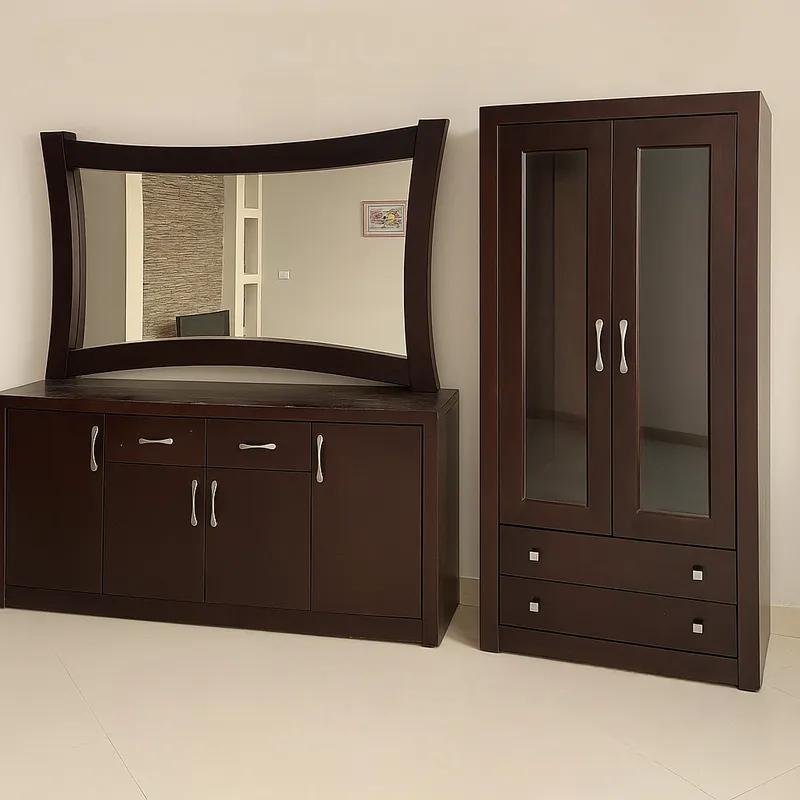 سفره مكونه من ٦ كراسي بالزجاج بوفيه كبيره بالمرايا والزجاج نيش ضرفتين ٣ رفوف ودرجين اللون بني غامق